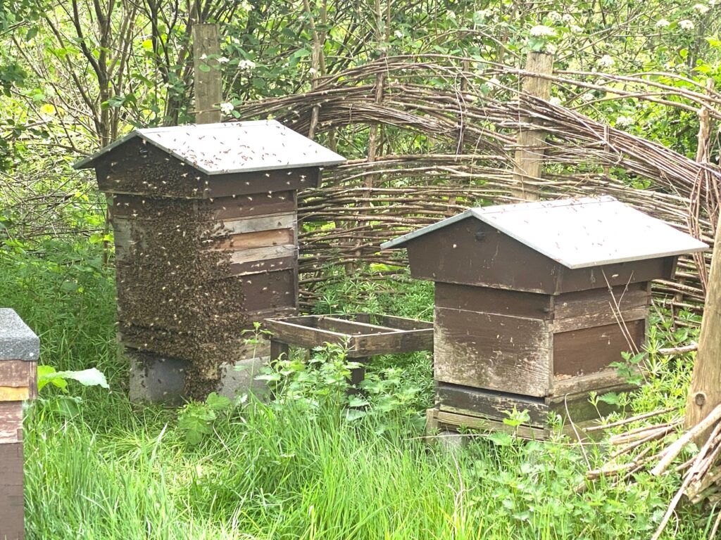 From the beginning we have had bees in three hives to help pollinate the orchard – and the honey is a gift from them. They make more than they need and members always buy up the surplus!