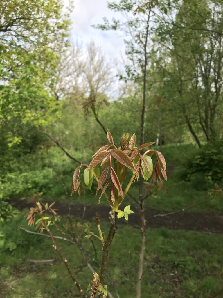 Our trees are varied in age and type: we have over 40 different native trees – some large old oaks, many smaller oak with ash, hazel, birch and hawthorn. In 2015 we planted 1,500 new trees including hazel and basket willow for coppicing and others not common locally such as bird cherry, aspen, walnut (in the picture) and scots pine.
