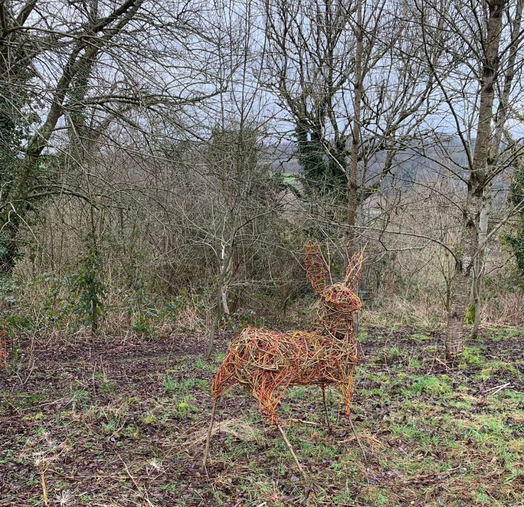 This year we used some of our colourful willow to make sculptures. Douglas the roe deer was commissioned for a conference on “Wilding gardens” at Manchester University. After featuring on stage at the conference, he has taken up residence among the trees.